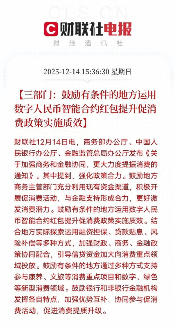 当三部门联合发文的消息在资本市场炸开时,无数投资者盯着手机屏幕倒吸冷气——消费板块终于等来了期待已久的"超级引擎"。这场由数字人民币智能合约红包点燃的消费革命,正在以肉眼可见的速度重塑市场格局,更让每个普通人的生活与财富增长产生奇妙共振。